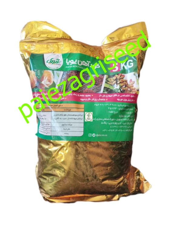 اده غذایی آهن، یکی از مواد غذایی کم مصرف است که وجود آن به اندازه کافی برای رشد گیاهان زراعی و باغی لازم است. و در تشکیل سبزینه گیاهان زراعی و باغی نقش ارزنده ای دارد.مزیت استفاده از کود آهن قابلیت جذب و مصرف هم از طریق خاک و هم از طریق برگ (محلول پاشی به نسبت یک در هزار) تسریع ریشه زایی گیاهان و درختان افزایش تعداد پنجه های بوته ها افزایش مقاومت گیاهان در برابر سرما افزایش مقاومت به سرمازدگی بهاره و زمستانه افزایش سطح برگ گیاهان افزایش تشکیل میوه کاهش ریزش میوه و گل خاصیت Slow Release یا رهایش تدریجی این کود جهت استفاده بهینه گیاه از مواد مغذیاین کود در اسیدی ترین تا قلیایی ترین محیط ها و خاک ها (رساندن مواد مغذی موجود در کود به گیاه در هر نوع خاک)کاربرد دارد موجود بودن عناصر دیگری مانند گوگرد، روی و منگنز در کود آهن جهت بهره وری بیشتر کود آهن یکی از بهترین منابع برای تأمین آهن مورد نیاز گیاهان و جبران کبمود این عنصر غذایی در مزارع و باغات، بخصوص در باغات پسته می باشد.
